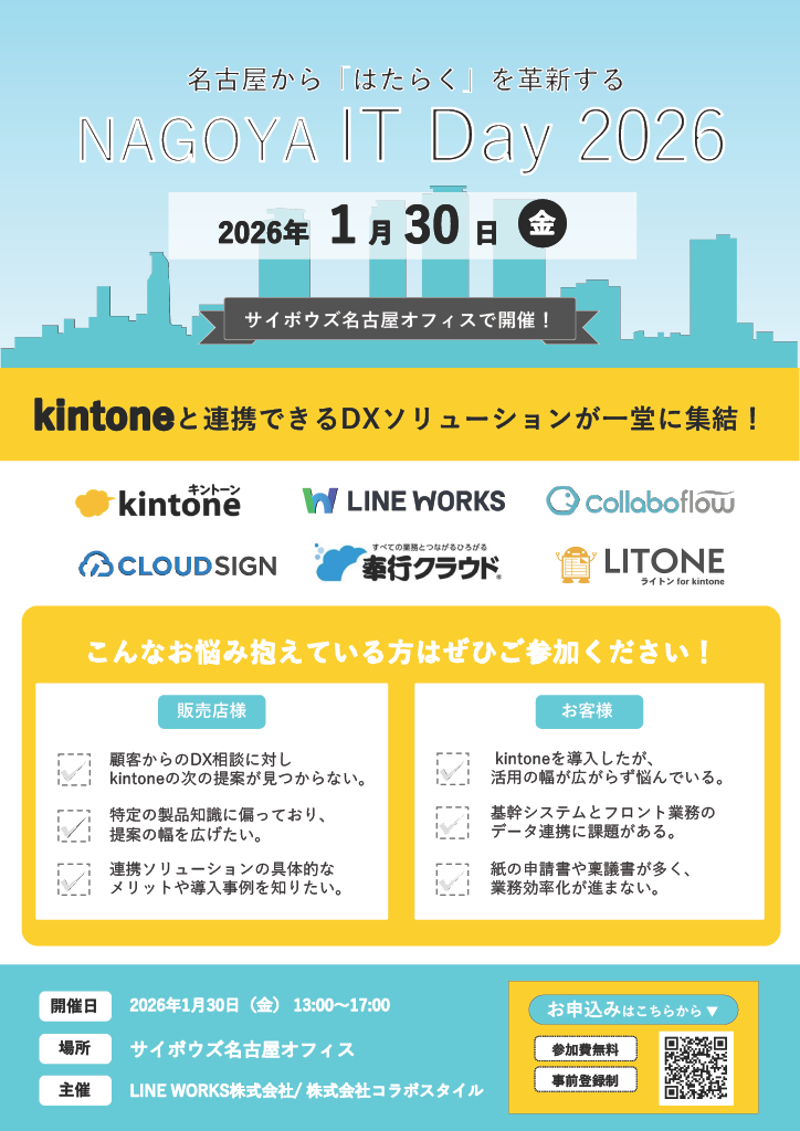 本イベントは、「名古屋から『はたらく』を革新する」をテーマに、kintoneと連携可能なDXソリューションが一堂に集まる展示・セミナーイベントです。
