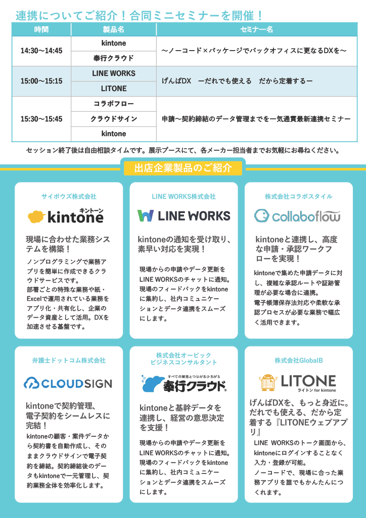 また、会場内では各社による合同ミニセミナーや、セッション終了後の自由相談タイムも予定されています。